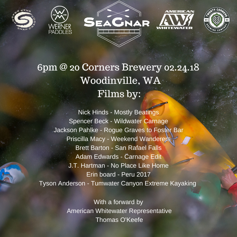Thank you to everyone that came out to SeaGnar this year! We watched 11 films and chose the top three. Andy Lockey’s film Groover Confessions took home the win as the people’s choice. Close behind in votes was Spencer Beck, and his film Adventure Wrecked. In third place came the trio - J.T. Hartman, Quinn Martell, and Noah Bader-Fourney - with their entry Just Jokin’. The crowd went home with swag from KAVU, The Kayak Academy, Werner Paddles, and Kokatat, with Sam Mcmillen taking home the Dagger Kayaks of his choice. Thank you to our sponsors who make this event possible by donating their time, gear, and space.
